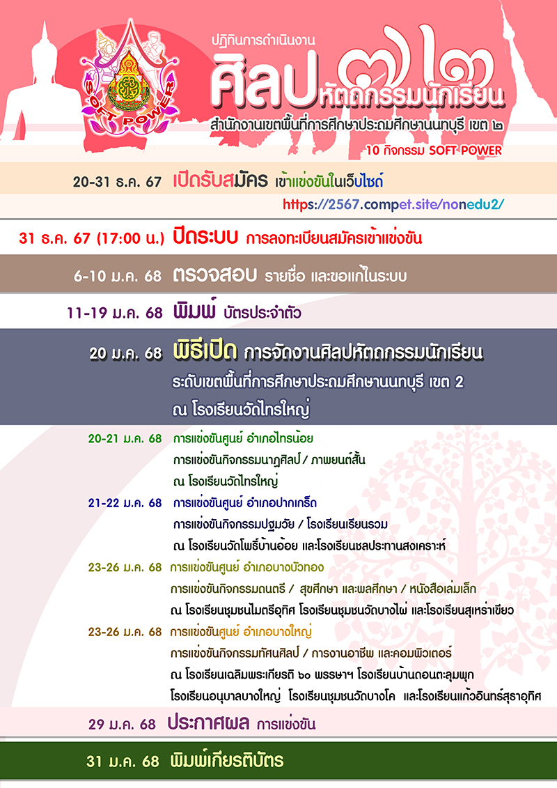 ปฏิทินการดำเนินงานศิลปหัตถกรรมนักเรียน ครั้งที่ ๗๒ ปีการศึกษา ๒๕๖๗ 2567.compet.site-nonedu2 ข่าวภาคกลาง 16 ธ.ค. 2024 3013 share tweet share การแข่งขันงานศิลปหัตถกรรมนักเรียน ครั้งที่ 72 สพป.นนทบุรี เขต 2 สำนักงานเขตพื้นที่การศึกษาประถมศึกษานนทบุรี เขต 2 สำนักงานเขตพื้นที่การศึกษาประถมศึกษานนทบุรี เขต 2 คลิกดูปฏิทิน tags: 12020000การแข่งขันงานวิชาการการแข่งขันงานศิลปหัตถกรรมนักเรียน ระดับเขตพื้นที่การศึกษา ปีการศึกษา 2567การแข่งขันศิลปหัตถรรมสพฐ.สพป.สพป.นนทบุรี เขต 2สพม.สำนักงานคณะกรรมการการศึกษาขั้นพื้นฐาน เรื่องที่เกี่ยวข้อง 2568.compet.site-UTT ข่าวภาคกลาง แบบขอเปลี่ยนตัว แบบขอเปลี่ยนชื่อ-นามสกุล (นำเอกสารยื่นต่อกรรมการ ณ วันที่ทำการแข่งขัน) 2568.compet.site-UTT ข่าวภาคกลาง เอกสารการแข่งขัน รูปเล่มรายงาน กิจกรรมการงานอาชีพ Soft Power สาขาอาหาร/สาขาออกแบบ/สาขาศิลปะ ให้จัดเตรียมมาส่งต่อคณะกรรมการในวันเข้าแข่งขัน 2568.compet.site-UTT ข่าวภาคกลาง การนำรถเข้าภายในบริเวณโรงเรียนอนุบาลวัดหนองขุนชาติ (อุทิศพิทยาคาร) ประตูเปิดเวลา 05.00 น. ปิดเวลา 08.00 น. โดยสามารถนำรถเข้าทางประตู 7 (ฝั่งร้านอาหารครัวกำนันแมว) และขับออกทางประตู 6 โดยขอความกรุณาให้รีบดำเนินการขยับรถออก เพื่อไม่ให้เกิดการจราจรติดขัด 2568.compet.site-UTT ข่าวภาคกลาง กิจกรรมหนังสือเล่มเล็ก Soft Power สาขาหนังสือ ระดับชั้น ป.4-ป.6, ม.1-ม.3 และกิจกรรมโรงเรียนเรียนรวม กลุ่ม Soft Power กลุ่มศิลปะ การแข่งขันการจัดทำหนังสือเล่มเล็ก (บกพร่องทางการเรียนรู้) ระดับชั้น ป.4-ป.6, ม.1-ม.3 กำหนดแข่งขันวันที่ 12 กันยายน 2568 เวลา 08.30 – 14.30 น. ณ ห้องประชุมอุทัยธรรม สพป.อุทัยธานี เขต 2 2568.compet.site-AekkachonRoiet3 ข่าวภาคตะวันออกเฉียงเหนือ ผลการประชุมกลุ่มฯ วันที่ 22 กันยายน 2568 2568.compet.site-AekkachonRoiet3 ข่าวภาคตะวันออกเฉียงเหนือ เกณฑ์การแข่งขัน งานศิลปหัตถกรรมนักเรียน ครั้งที่ 73 ปีการศึกษา 2568