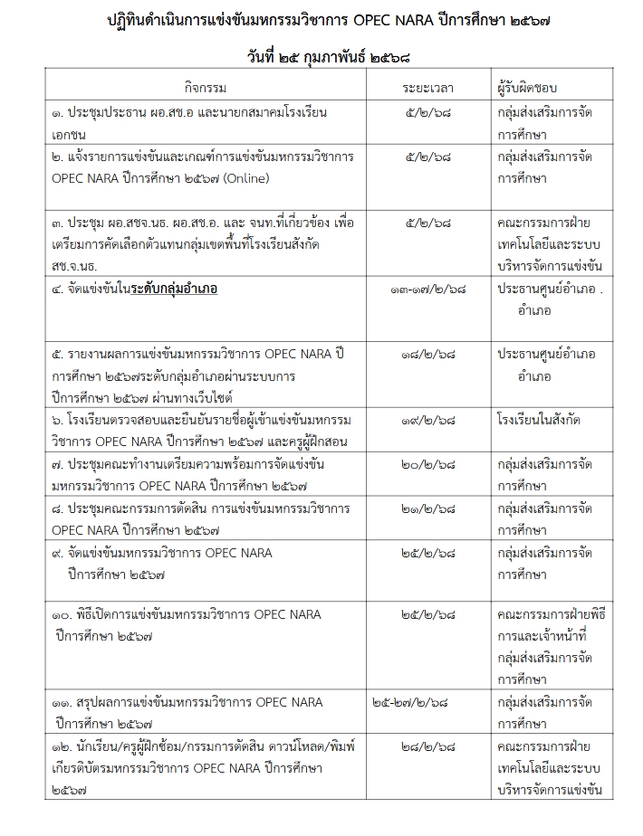 ปฏิทินการดำเนินงาน มหกรรมวิชาการ OPEC NARA 2567.compet.site-OpecnaraEd ข่าวภาคใต้ 17 ก.พ. 2025 144 share tweet share สช.จ.นราธิวาส สำนักงานการศึกษาเอกชนจังหวัดนราธิวาส tags: PRIVATE023การแข่งขันงานวิชาการการแข่งขันศิลปหัตถรรมสช.จ.นราธิวาสสพฐ.สพป.สพม.สำนักงานการศึกษาเอกชนจังหวัดปัตตานีสำนักงานคณะกรรมการการศึกษาขั้นพื้นฐาน เรื่องที่เกี่ยวข้อง 2568.compet.site-UTT ข่าวภาคกลาง แบบขอเปลี่ยนตัว แบบขอเปลี่ยนชื่อ-นามสกุล (นำเอกสารยื่นต่อกรรมการ ณ วันที่ทำการแข่งขัน) 2568.compet.site-UTT ข่าวภาคกลาง เอกสารการแข่งขัน รูปเล่มรายงาน กิจกรรมการงานอาชีพ Soft Power สาขาอาหาร/สาขาออกแบบ/สาขาศิลปะ ให้จัดเตรียมมาส่งต่อคณะกรรมการในวันเข้าแข่งขัน 2568.compet.site-UTT ข่าวภาคกลาง การนำรถเข้าภายในบริเวณโรงเรียนอนุบาลวัดหนองขุนชาติ (อุทิศพิทยาคาร) ประตูเปิดเวลา 05.00 น. ปิดเวลา 08.00 น. โดยสามารถนำรถเข้าทางประตู 7 (ฝั่งร้านอาหารครัวกำนันแมว) และขับออกทางประตู 6 โดยขอความกรุณาให้รีบดำเนินการขยับรถออก เพื่อไม่ให้เกิดการจราจรติดขัด 2568.compet.site-UTT ข่าวภาคกลาง กิจกรรมหนังสือเล่มเล็ก Soft Power สาขาหนังสือ ระดับชั้น ป.4-ป.6, ม.1-ม.3 และกิจกรรมโรงเรียนเรียนรวม กลุ่ม Soft Power กลุ่มศิลปะ การแข่งขันการจัดทำหนังสือเล่มเล็ก (บกพร่องทางการเรียนรู้) ระดับชั้น ป.4-ป.6, ม.1-ม.3 กำหนดแข่งขันวันที่ 12 กันยายน 2568 เวลา 08.30 – 14.30 น. ณ ห้องประชุมอุทัยธรรม สพป.อุทัยธานี เขต 2 2568.compet.site-AekkachonRoiet3 ข่าวภาคตะวันออกเฉียงเหนือ ผลการประชุมกลุ่มฯ วันที่ 22 กันยายน 2568 2568.compet.site-AekkachonRoiet3 ข่าวภาคตะวันออกเฉียงเหนือ เกณฑ์การแข่งขัน งานศิลปหัตถกรรมนักเรียน ครั้งที่ 73 ปีการศึกษา 2568