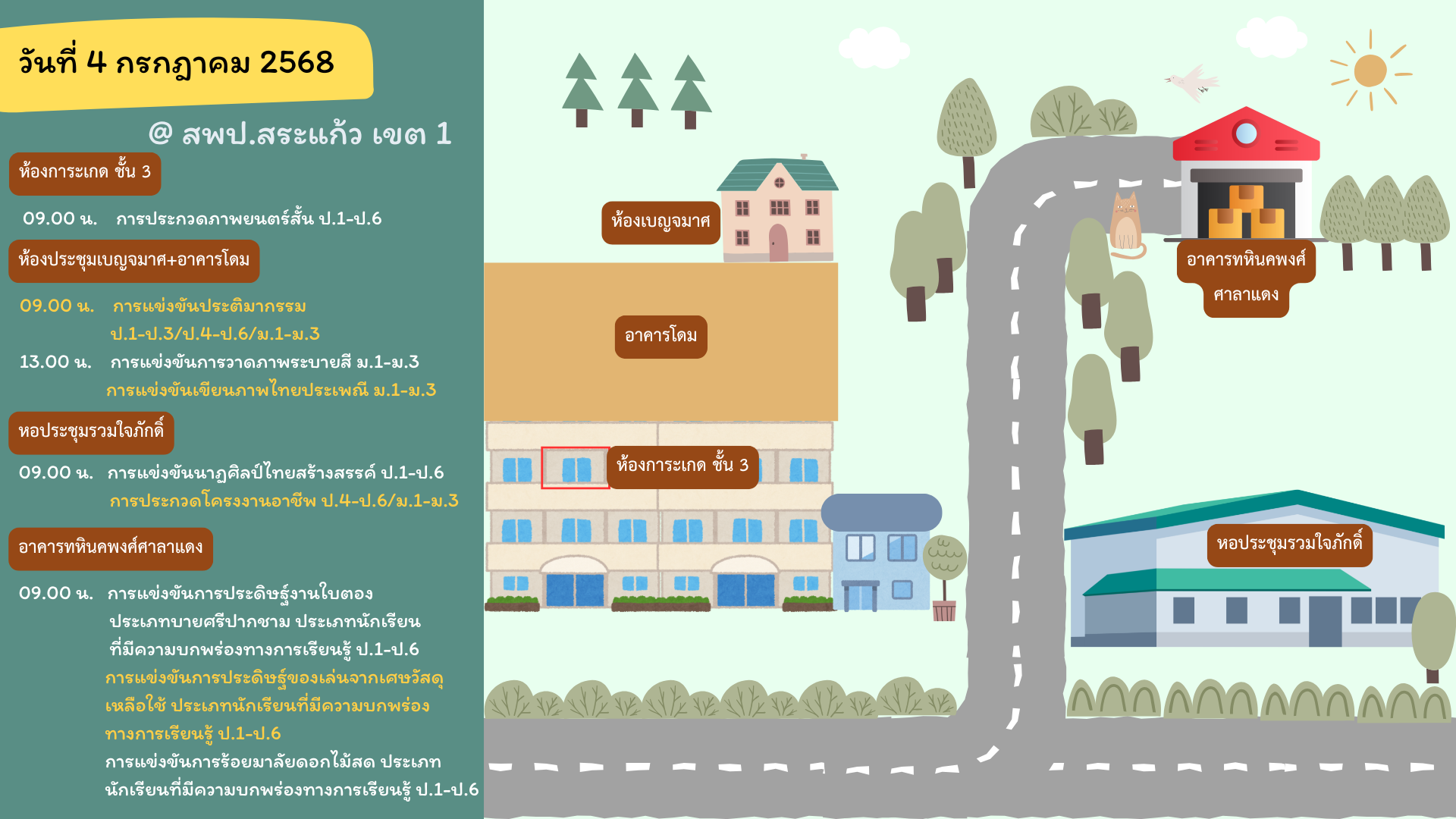 แผนผังสนามแข่งขัน สพป.สระแก้ว เขต 1 วันที่ 4 กรกฎาคม 2568 2567.compet.site-SKW1 ข่าวภาคตะวันออก 25 มิ.ย. 2025 186 share tweet share “นวัตกรรมเเห่งความสุข สร้างสรรค์สนุกหัตถศิลป์ ร้อยรวมพหุปัญญาท้องถิ่น Soft Power มิ่งไมตรีศรีบูรพา” สำนักงานเขตพื้นที่การศึกษาประถมศึกษาสระแก้ว เขต 1 – tags: “นวัตกรรมเเห่งความสุข สร้างสรรค์สนุกหัตถศิลป์ ร้อยรวมพหุปัญญาท้องถิ่น Soft Power มิ่งไมตรีศรีบูรพา”27010000การแข่งขันงานวิชาการการแข่งขันศิลปหัตถรรมสพฐ.สพป.สพป.สระแก้ว เขต 1สพม.สำนักงานคณะกรรมการการศึกษาขั้นพื้นฐาน เรื่องที่เกี่ยวข้อง 2568.compet.site-UTT ข่าวภาคกลาง แบบขอเปลี่ยนตัว แบบขอเปลี่ยนชื่อ-นามสกุล (นำเอกสารยื่นต่อกรรมการ ณ วันที่ทำการแข่งขัน) 2568.compet.site-UTT ข่าวภาคกลาง เอกสารการแข่งขัน รูปเล่มรายงาน กิจกรรมการงานอาชีพ Soft Power สาขาอาหาร/สาขาออกแบบ/สาขาศิลปะ ให้จัดเตรียมมาส่งต่อคณะกรรมการในวันเข้าแข่งขัน 2568.compet.site-UTT ข่าวภาคกลาง การนำรถเข้าภายในบริเวณโรงเรียนอนุบาลวัดหนองขุนชาติ (อุทิศพิทยาคาร) ประตูเปิดเวลา 05.00 น. ปิดเวลา 08.00 น. โดยสามารถนำรถเข้าทางประตู 7 (ฝั่งร้านอาหารครัวกำนันแมว) และขับออกทางประตู 6 โดยขอความกรุณาให้รีบดำเนินการขยับรถออก เพื่อไม่ให้เกิดการจราจรติดขัด 2568.compet.site-UTT ข่าวภาคกลาง กิจกรรมหนังสือเล่มเล็ก Soft Power สาขาหนังสือ ระดับชั้น ป.4-ป.6, ม.1-ม.3 และกิจกรรมโรงเรียนเรียนรวม กลุ่ม Soft Power กลุ่มศิลปะ การแข่งขันการจัดทำหนังสือเล่มเล็ก (บกพร่องทางการเรียนรู้) ระดับชั้น ป.4-ป.6, ม.1-ม.3 กำหนดแข่งขันวันที่ 12 กันยายน 2568 เวลา 08.30 – 14.30 น. ณ ห้องประชุมอุทัยธรรม สพป.อุทัยธานี เขต 2 2568.compet.site-AekkachonRoiet3 ข่าวภาคตะวันออกเฉียงเหนือ ผลการประชุมกลุ่มฯ วันที่ 22 กันยายน 2568 2568.compet.site-AekkachonRoiet3 ข่าวภาคตะวันออกเฉียงเหนือ เกณฑ์การแข่งขัน งานศิลปหัตถกรรมนักเรียน ครั้งที่ 73 ปีการศึกษา 2568