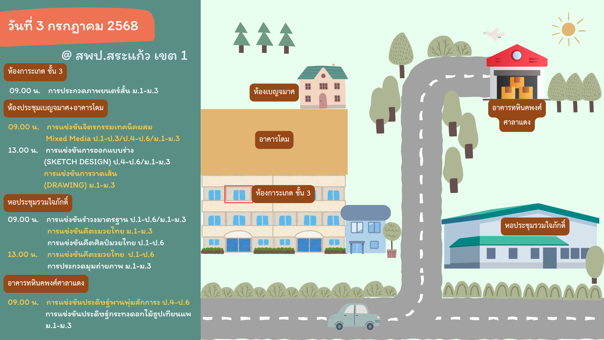 แผนผังสนามแข่งขัน สพป.สระแก้ว เขต 1 วันที่ 3 กรกฎาคม 2568 2567.compet.site-SKW1 ข่าวภาคตะวันออก 25 มิ.ย. 2025 260 share tweet share “นวัตกรรมเเห่งความสุข สร้างสรรค์สนุกหัตถศิลป์ ร้อยรวมพหุปัญญาท้องถิ่น Soft Power มิ่งไมตรีศรีบูรพา” สำนักงานเขตพื้นที่การศึกษาประถมศึกษาสระแก้ว เขต 1 – tags: “นวัตกรรมเเห่งความสุข สร้างสรรค์สนุกหัตถศิลป์ ร้อยรวมพหุปัญญาท้องถิ่น Soft Power มิ่งไมตรีศรีบูรพา”27010000การแข่งขันงานวิชาการการแข่งขันศิลปหัตถรรมสพฐ.สพป.สพป.สระแก้ว เขต 1สพม.สำนักงานคณะกรรมการการศึกษาขั้นพื้นฐาน เรื่องที่เกี่ยวข้อง 2568.compet.site-UTT ข่าวภาคกลาง แบบขอเปลี่ยนตัว แบบขอเปลี่ยนชื่อ-นามสกุล (นำเอกสารยื่นต่อกรรมการ ณ วันที่ทำการแข่งขัน) 2568.compet.site-UTT ข่าวภาคกลาง เอกสารการแข่งขัน รูปเล่มรายงาน กิจกรรมการงานอาชีพ Soft Power สาขาอาหาร/สาขาออกแบบ/สาขาศิลปะ ให้จัดเตรียมมาส่งต่อคณะกรรมการในวันเข้าแข่งขัน 2568.compet.site-UTT ข่าวภาคกลาง การนำรถเข้าภายในบริเวณโรงเรียนอนุบาลวัดหนองขุนชาติ (อุทิศพิทยาคาร) ประตูเปิดเวลา 05.00 น. ปิดเวลา 08.00 น. โดยสามารถนำรถเข้าทางประตู 7 (ฝั่งร้านอาหารครัวกำนันแมว) และขับออกทางประตู 6 โดยขอความกรุณาให้รีบดำเนินการขยับรถออก เพื่อไม่ให้เกิดการจราจรติดขัด 2568.compet.site-UTT ข่าวภาคกลาง กิจกรรมหนังสือเล่มเล็ก Soft Power สาขาหนังสือ ระดับชั้น ป.4-ป.6, ม.1-ม.3 และกิจกรรมโรงเรียนเรียนรวม กลุ่ม Soft Power กลุ่มศิลปะ การแข่งขันการจัดทำหนังสือเล่มเล็ก (บกพร่องทางการเรียนรู้) ระดับชั้น ป.4-ป.6, ม.1-ม.3 กำหนดแข่งขันวันที่ 12 กันยายน 2568 เวลา 08.30 – 14.30 น. ณ ห้องประชุมอุทัยธรรม สพป.อุทัยธานี เขต 2 2568.compet.site-AekkachonRoiet3 ข่าวภาคตะวันออกเฉียงเหนือ ผลการประชุมกลุ่มฯ วันที่ 22 กันยายน 2568 2568.compet.site-AekkachonRoiet3 ข่าวภาคตะวันออกเฉียงเหนือ เกณฑ์การแข่งขัน งานศิลปหัตถกรรมนักเรียน ครั้งที่ 73 ปีการศึกษา 2568