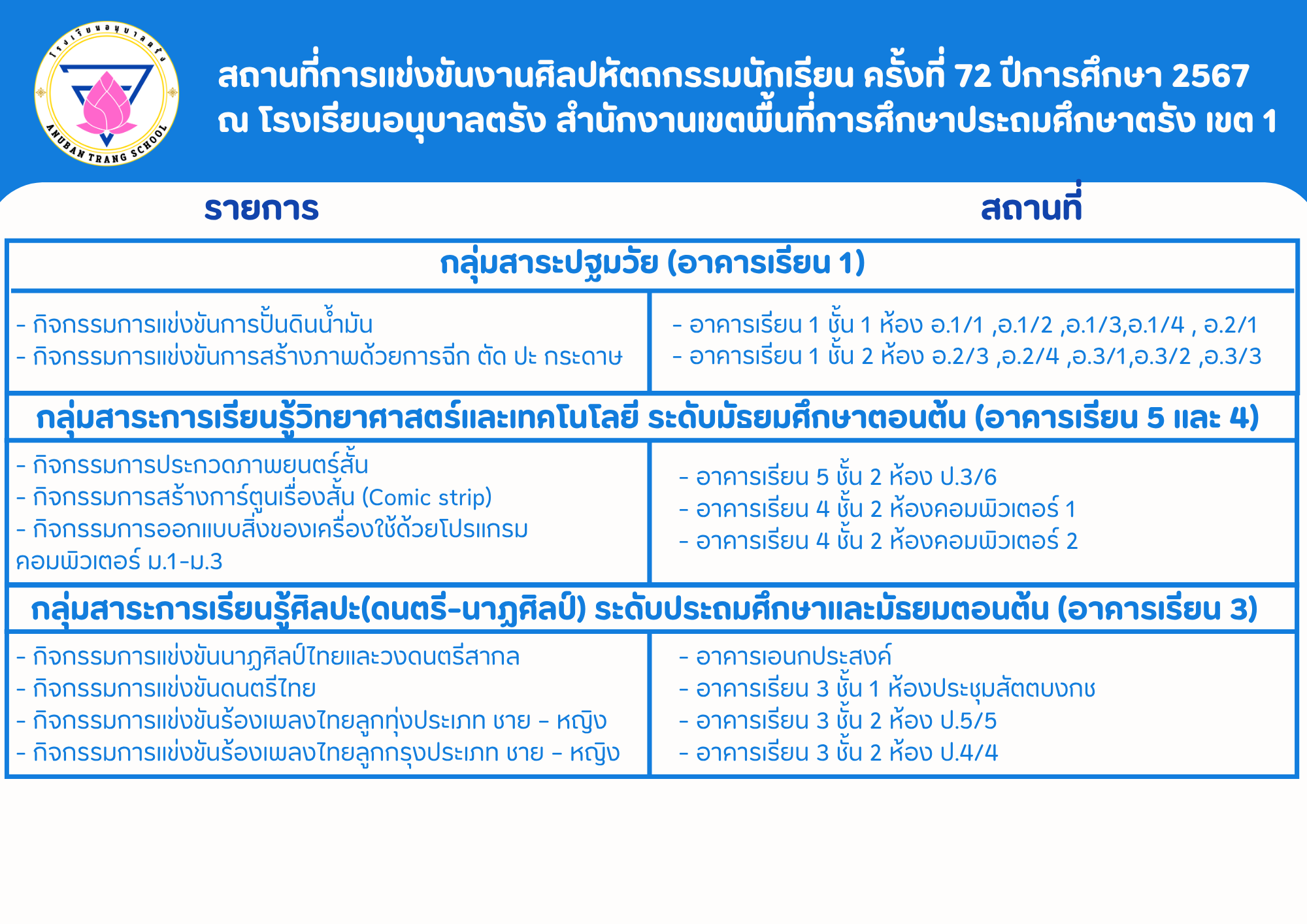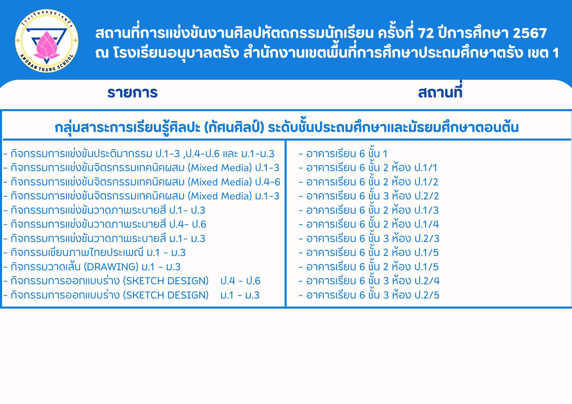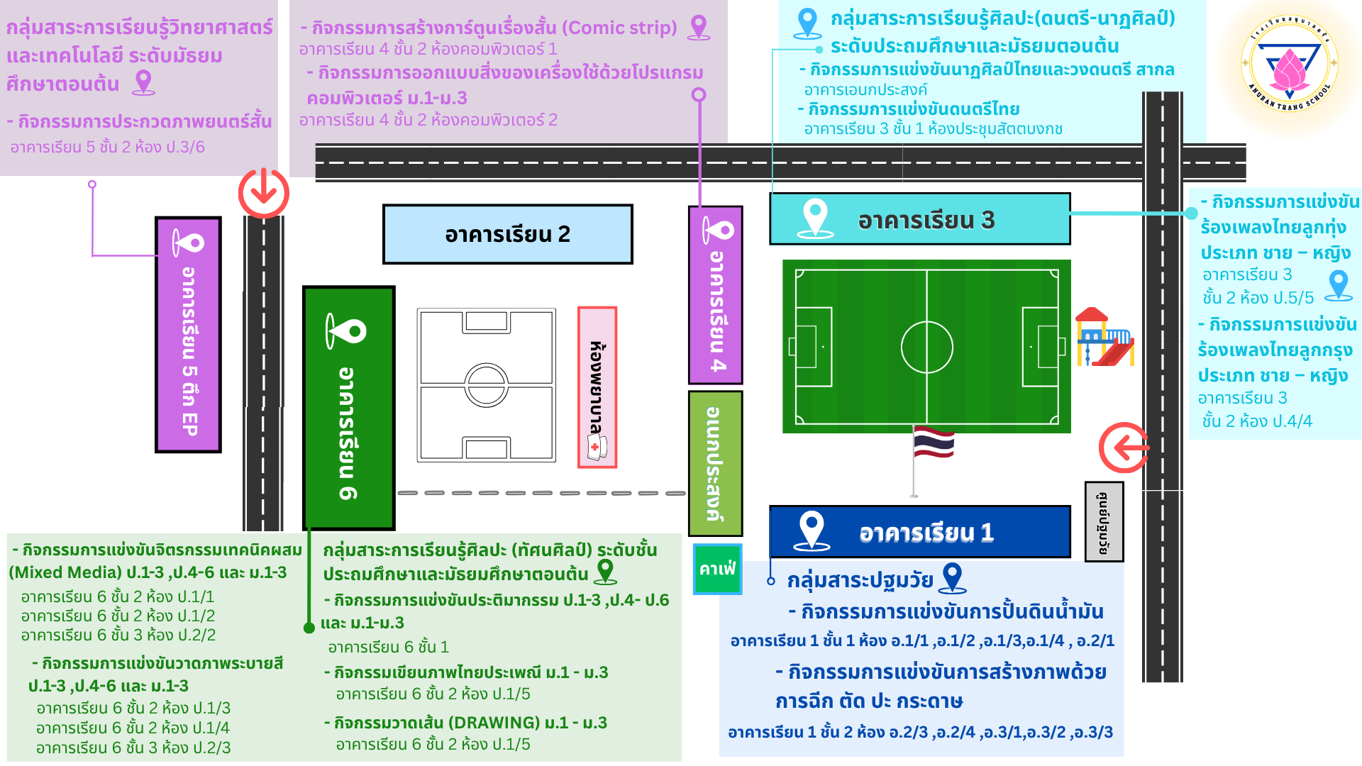แผนผังสถานที่แข่งขัน รายการแข่งขัน ของโรงเรียนอนุบาลตรัง 2568.compet.site-Trang1 ข่าวภาคใต้ 26 ก.ค. 2025 252 share tweet share สำนักงานเขตพื้นที่การศึกษาประถมศึกษาตรัง เขต 1 tags: 92010000การแข่งขันงานวิชาการการแข่งขันศิลปหัตถรรมสพฐ.สพป.สพป.ตรัง เขต 1สพม.สำนักงานคณะกรรมการการศึกษาขั้นพื้นฐานสำนักงานเขตพื้นที่การศึกษาประถมศึกษากระบี่ เรื่องที่เกี่ยวข้อง 2568.compet.site-UTT ข่าวภาคกลาง แบบขอเปลี่ยนตัว แบบขอเปลี่ยนชื่อ-นามสกุล (นำเอกสารยื่นต่อกรรมการ ณ วันที่ทำการแข่งขัน) 2568.compet.site-UTT ข่าวภาคกลาง เอกสารการแข่งขัน รูปเล่มรายงาน กิจกรรมการงานอาชีพ Soft Power สาขาอาหาร/สาขาออกแบบ/สาขาศิลปะ ให้จัดเตรียมมาส่งต่อคณะกรรมการในวันเข้าแข่งขัน 2568.compet.site-UTT ข่าวภาคกลาง การนำรถเข้าภายในบริเวณโรงเรียนอนุบาลวัดหนองขุนชาติ (อุทิศพิทยาคาร) ประตูเปิดเวลา 05.00 น. ปิดเวลา 08.00 น. โดยสามารถนำรถเข้าทางประตู 7 (ฝั่งร้านอาหารครัวกำนันแมว) และขับออกทางประตู 6 โดยขอความกรุณาให้รีบดำเนินการขยับรถออก เพื่อไม่ให้เกิดการจราจรติดขัด 2568.compet.site-UTT ข่าวภาคกลาง กิจกรรมหนังสือเล่มเล็ก Soft Power สาขาหนังสือ ระดับชั้น ป.4-ป.6, ม.1-ม.3 และกิจกรรมโรงเรียนเรียนรวม กลุ่ม Soft Power กลุ่มศิลปะ การแข่งขันการจัดทำหนังสือเล่มเล็ก (บกพร่องทางการเรียนรู้) ระดับชั้น ป.4-ป.6, ม.1-ม.3 กำหนดแข่งขันวันที่ 12 กันยายน 2568 เวลา 08.30 – 14.30 น. ณ ห้องประชุมอุทัยธรรม สพป.อุทัยธานี เขต 2 2568.compet.site-AekkachonRoiet3 ข่าวภาคตะวันออกเฉียงเหนือ ผลการประชุมกลุ่มฯ วันที่ 22 กันยายน 2568 2568.compet.site-AekkachonRoiet3 ข่าวภาคตะวันออกเฉียงเหนือ เกณฑ์การแข่งขัน งานศิลปหัตถกรรมนักเรียน ครั้งที่ 73 ปีการศึกษา 2568