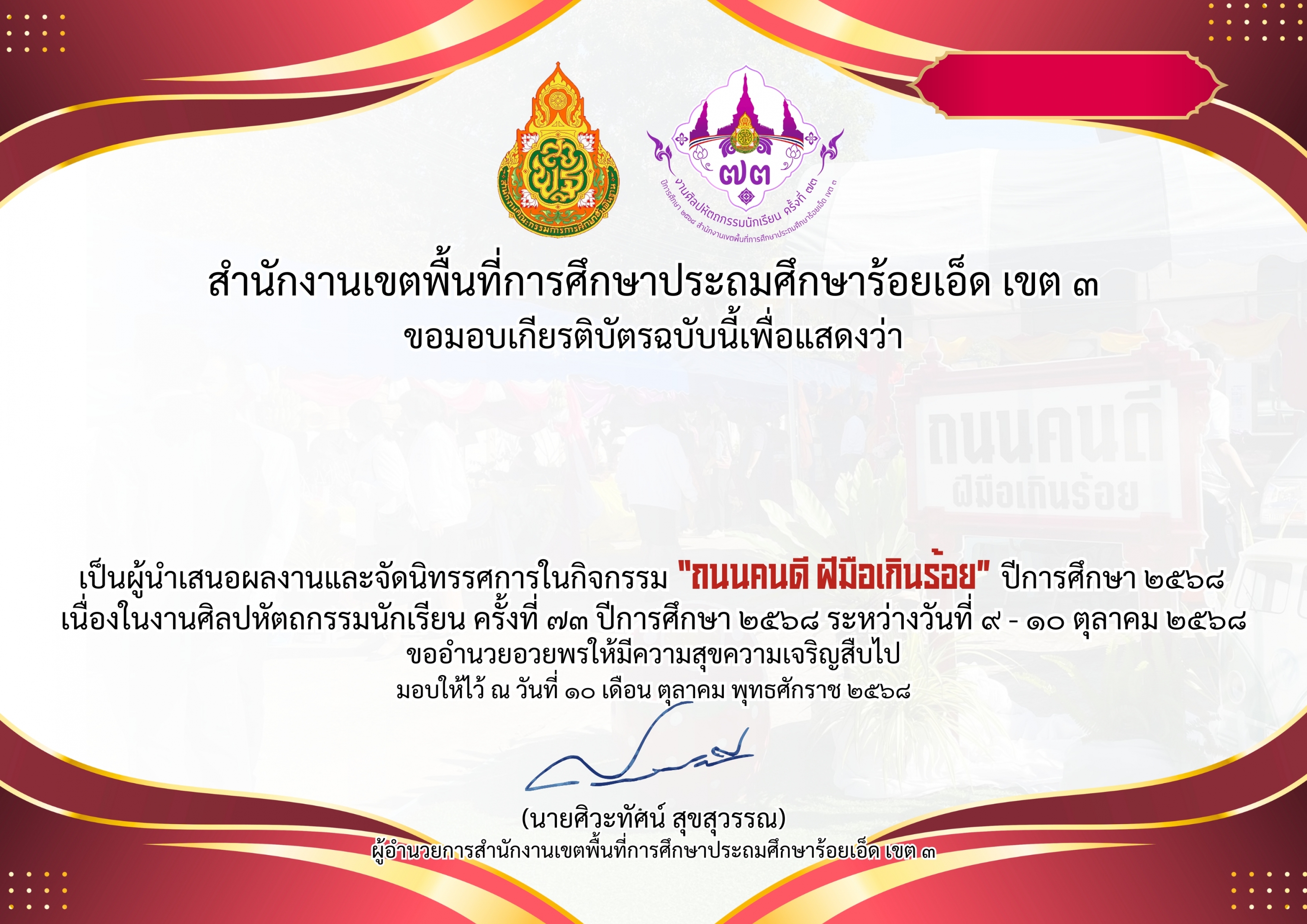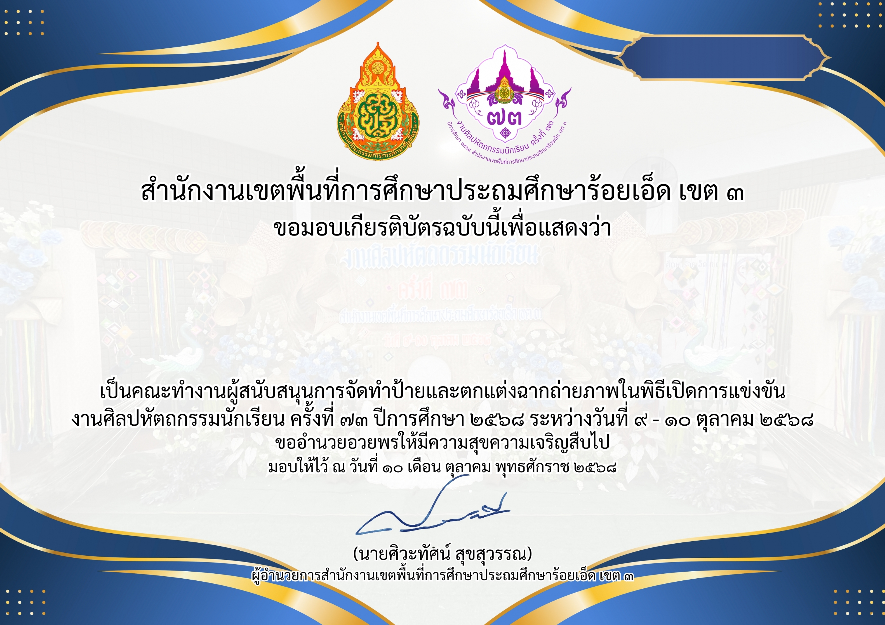 เกียรติบัตรคณะทำงานผู้สนับสนุนการจัดทำป้ายและตกแต่งฉากถ่ายภาพในพิธีเปิดการแข่งขัน งานศิลปหัตถกรรมนักเรียน ครั้งที่ ๗๓ ปีการศึกษา ๒๕๖๘ ระหว่างวันที่ ๙ – ๑๐ ตุลาคม ๒๕๖๘
