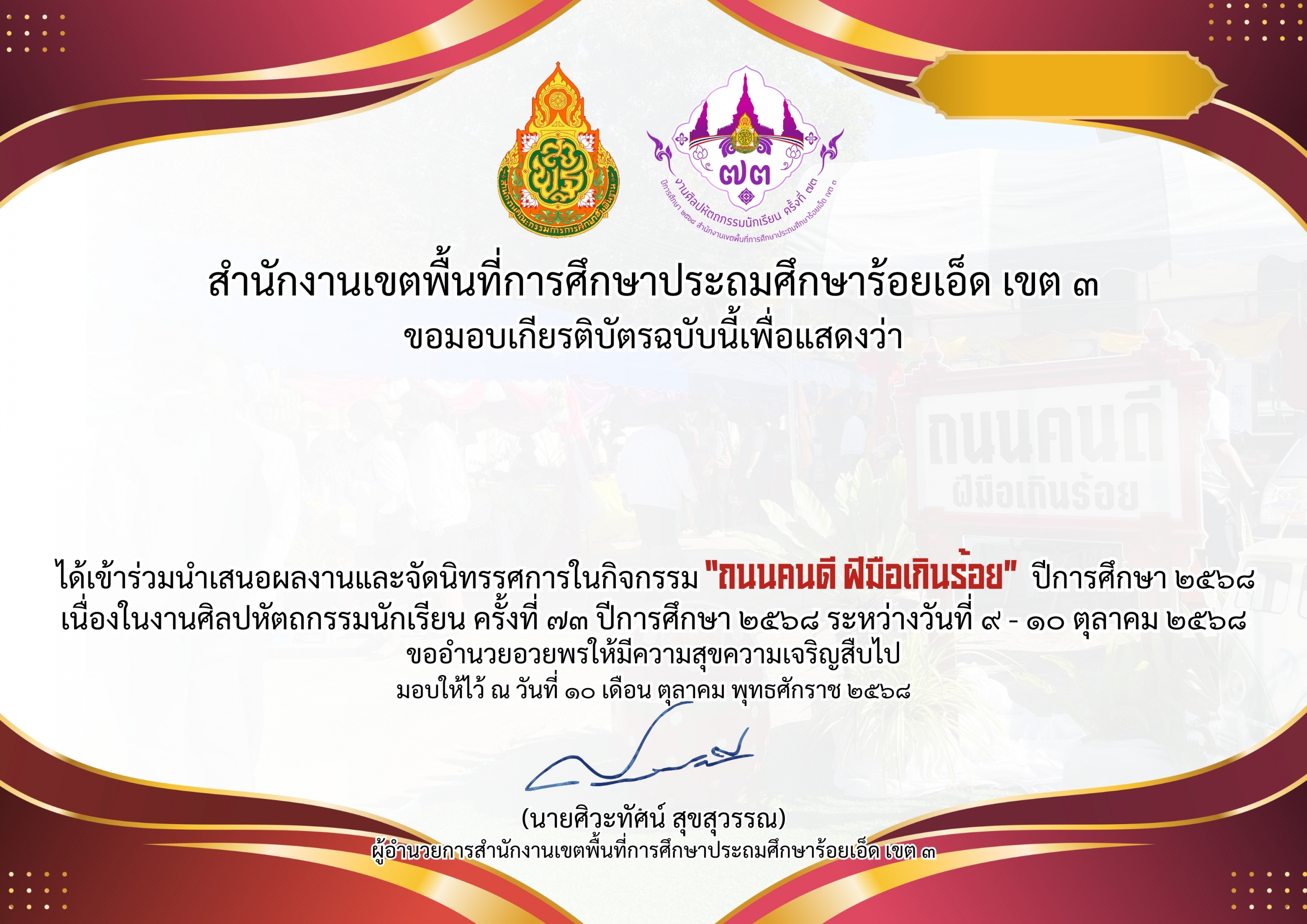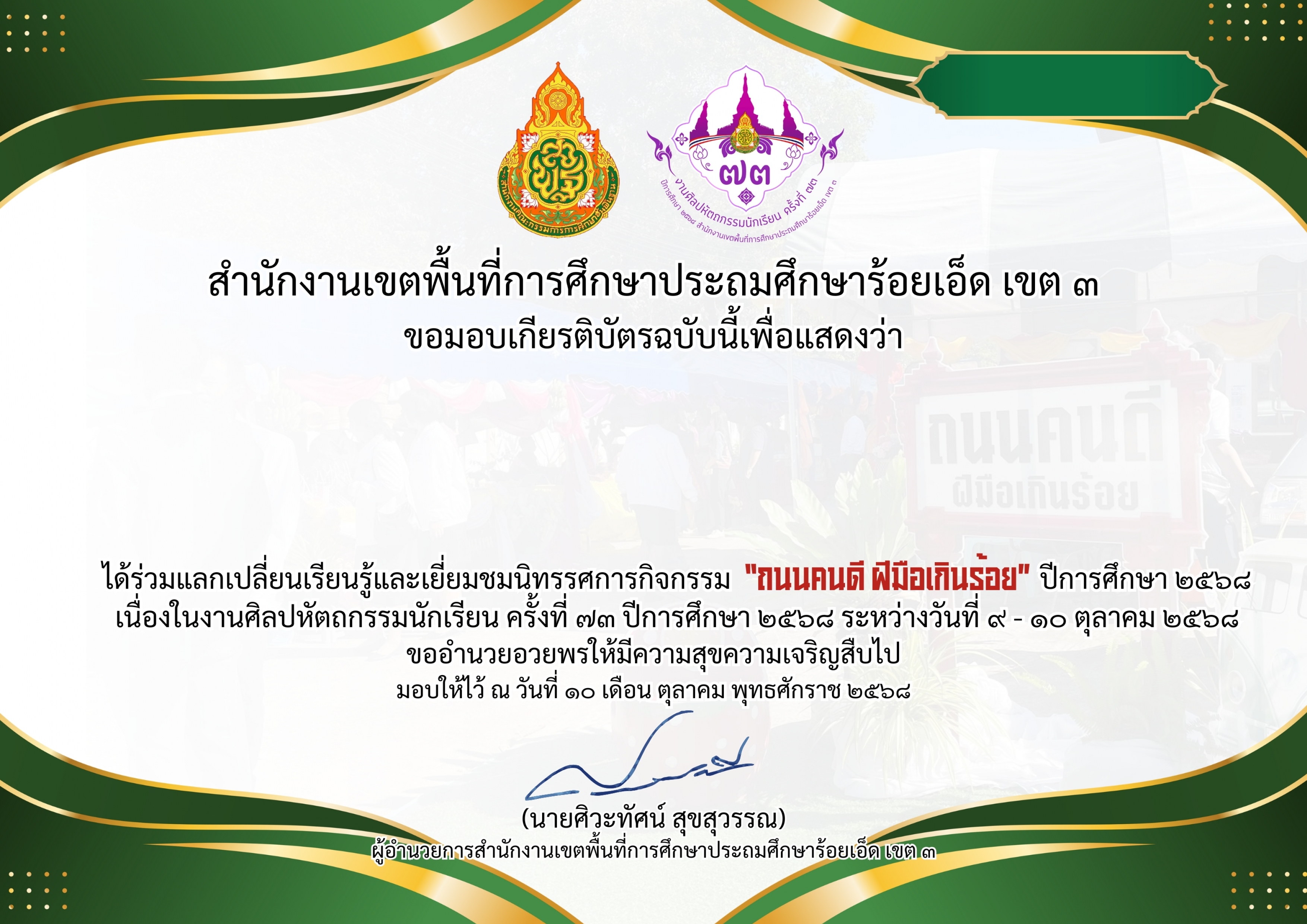 เกียรติบัตรผู้เยี่ยมชมนิทรรศการกิจกรรม “ถนนคนดี ฝีมือเกินร้อย” ปีการศึกษา ๒๕๖๘ เนื่องในงานศิลปหัตถกรรมนักเรียน ครั้งที่ ๗๓ ปีการศึกษา ๒๕๖๘ ระหว่างวันที่ ๙ – ๑๐ ตุลาคม ๒๕๖๘