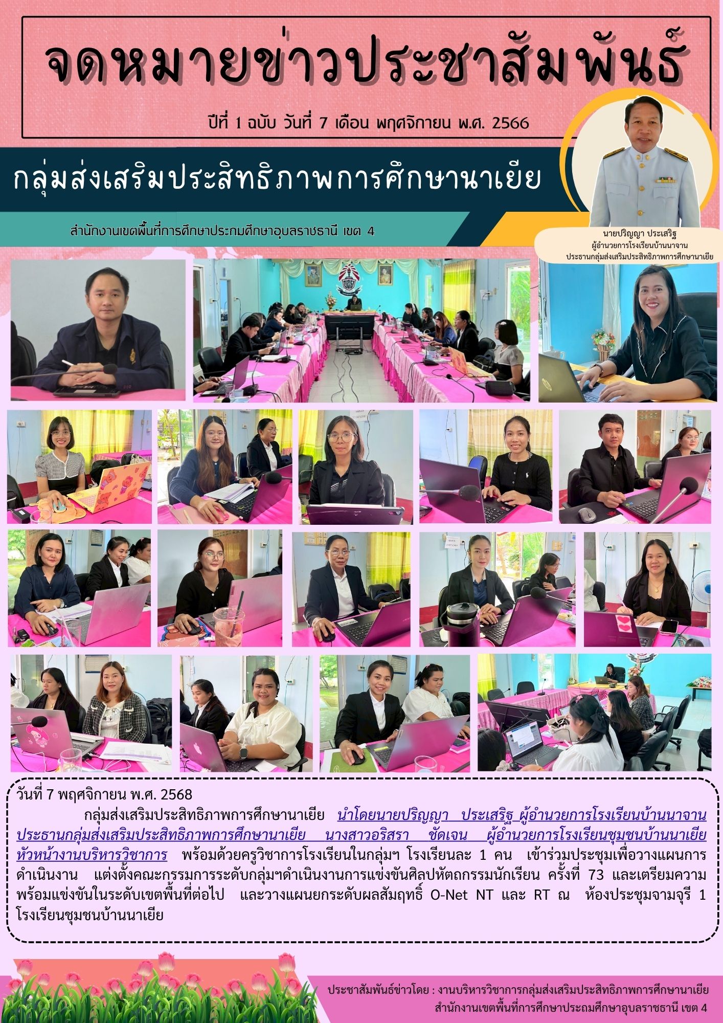 นายปริญญา ประเสริฐ ประธานกลุ่มส่งเสริมประสิทธิภาพการศึกษานาเยีย นางสาวอริสรา ชัดเจน ผู้อำนวยการโรงเรียนชุมชนบ้านนาเยีย หัวหน้าวิชาการกลุ่มและนายพัมนพงษ์ พงษ์จันโอ รองผู้อำนวยการโรงเรียนชุมชนบ้านนาเยีย ได้ประชุมหัวหน้าวิชาการโรงเรียนในกลุ่มส่งเสริมประสิทธิภาพการศึกษานาเยีย เพื่อเตรียมความพร้อมในการแข่งขันศิลปหัตถกรรมนักเรียน ครั้งที่ 73 และการยกระดับผลสัมฤิทธิ์ของกลุ่ม