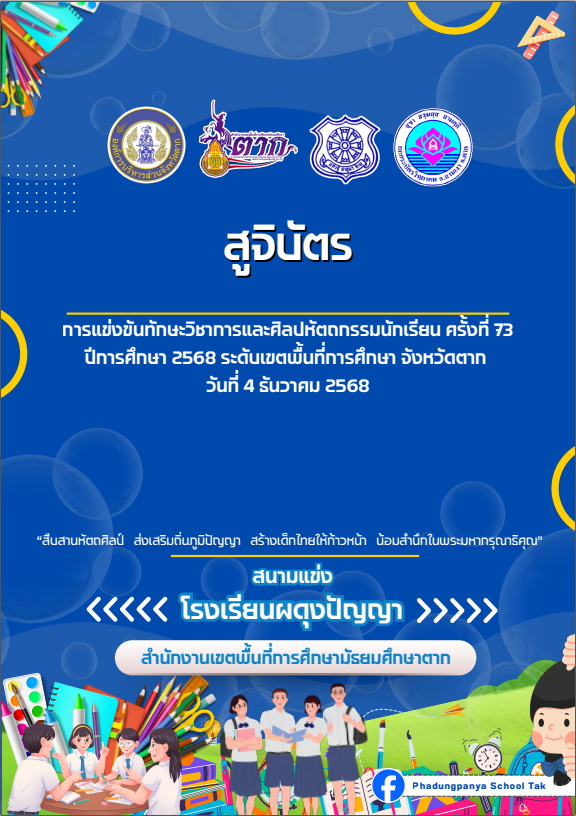 สูจิบัตร ศิลปหัตถกรรมนักเรียนครั้งที่ 73 สนามแข่ง รร.ผดุงปัญญา 946577 18 พ.ย. 2025 63 share tweet share สูจิบัตร ศิลปหัตถกรรมนักเรียนครั้งที่73 สนามแข่ง รร.ผดุงปัญญา