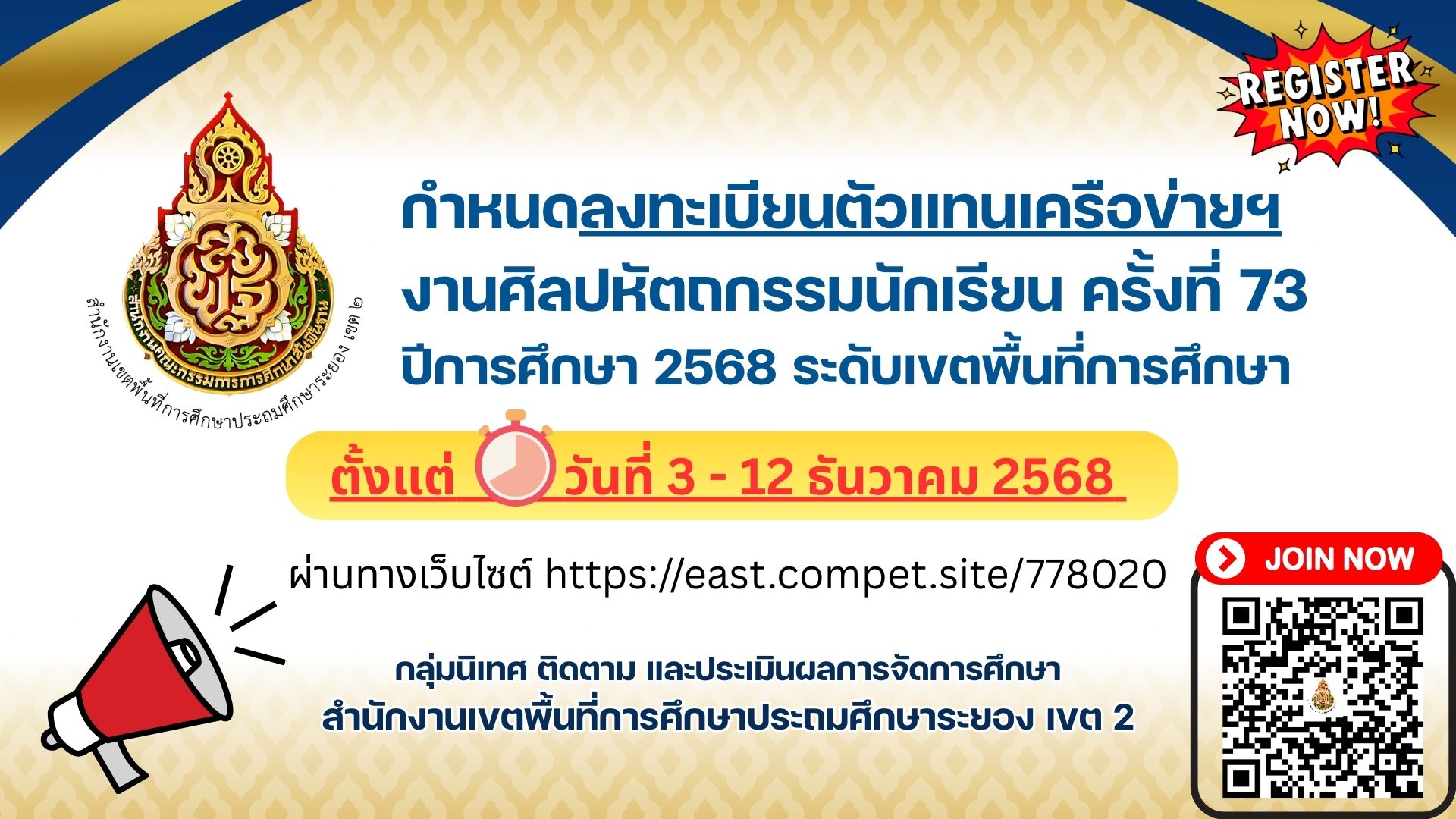 กำหนดลงทะเบียน ตัวแทนเครือข่ายการศึกษาฯ งานศิลปหัตถกรรมนักเรียน ครั้งที่ 73 ปีการศึกษา 2568 ระดับเขตพื้นที่การศึกษา 778020 04 ธ.ค. 2025 41 share tweet share กำหนดลงทะเบียน ตัวแทนเครือข่ายการศึกษาฯ งานศิลปหัตถกรรมนักเรียน ครั้งที่ 73 ปีการศึกษา 2568 ระดับเขตพื้นที่การศึกษาระยะเวลา ตั้งแต่วันที่ 3 – 12 ธันวาคม 2568 ผ่านทางเว็บไซต์ https://east.compet.site/778020
