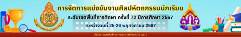 งานศิลปหัตถกรรมนักเรียน ระดับเขตพื้นที่การศึกษา ครั้งที่ 72 ปีการศึกษา 2567 สำนักงานเขตพื้นที่การศึกษาประถมศึกษาน่าน เขต 1เพลงประจำการแข่งขันงานศิลปหัตถกรรมนักเรียน ระดับเขตพื้นที่การศึกษา ครั้งที่ 72 ปีการศึกษา 2567 สำนักงานเขตพื้นที่การศึกษาประถมศึกษาน่าน เขต 1